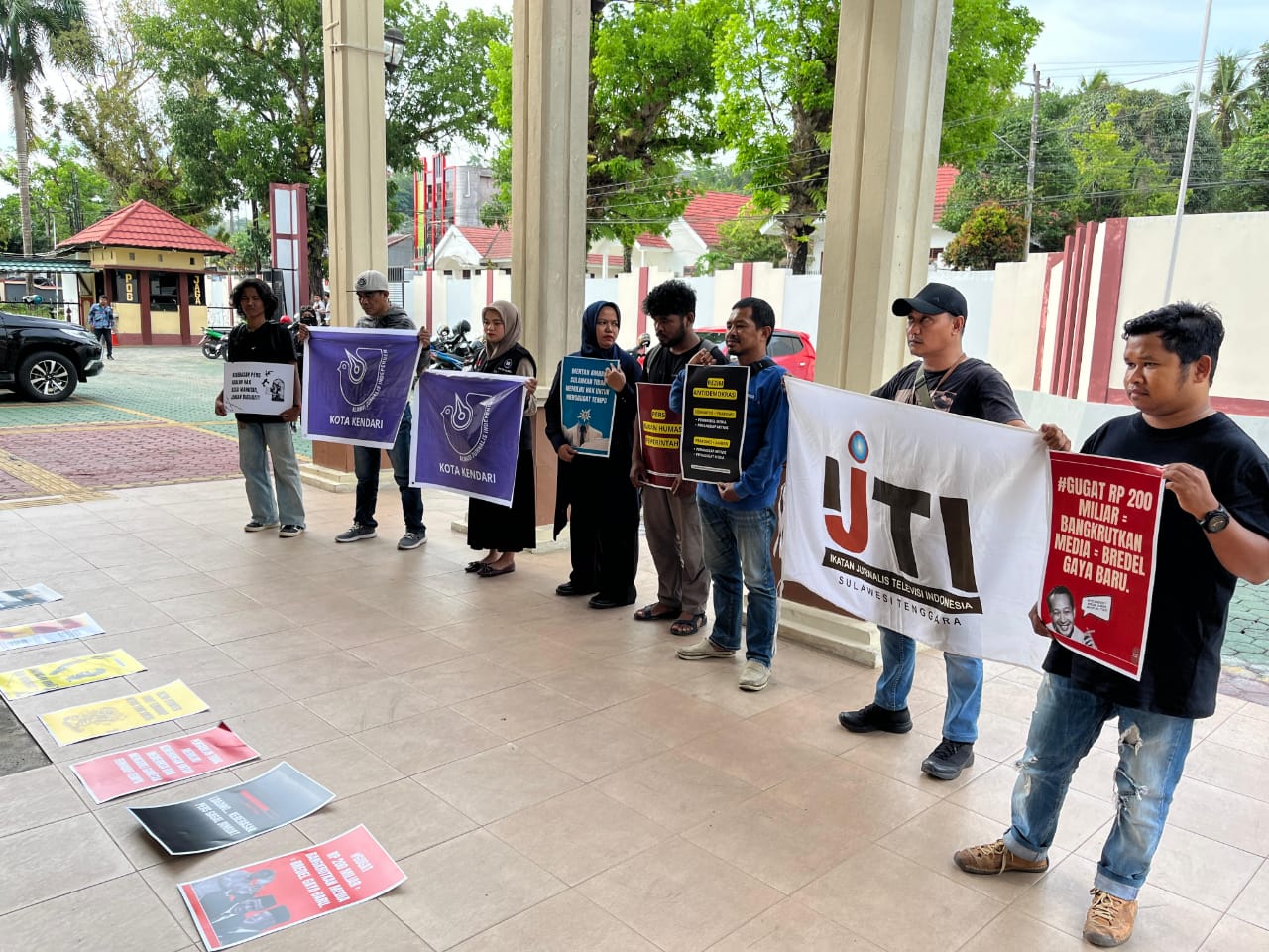 MEDIASULTRA.CO.ID I KENDARI – Aliansi Jurnalis Independen (AJI) Kendari, Komite Keselamatan Jurnalis (KKJ) Sulawesi Tenggara (Sultra), IJTI Sultra, dan LPM IAIN Kendari berunjukrasa di depan Kantor Pengadilan Negeri Kendari, Kamis 6 November 2025.