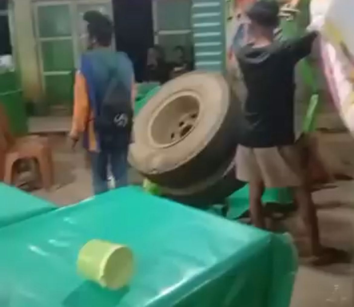 Ban mobil kontainer yang terlepas itu kemudian mengarah ke area rumah makan sehingga menimbulkan kepanikan warga dan pengunjung.