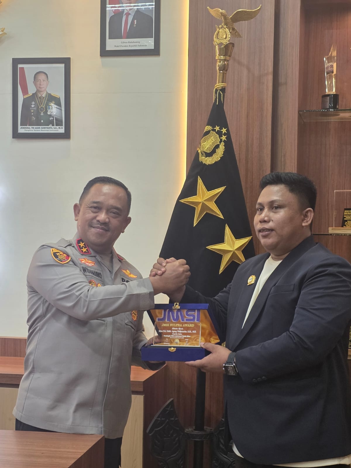 Penghargaan tersebut diberikan atas penilaian JMSI Sultra terhadap Kapolda Sultra sebagai Pemimpin Mitra Informasi Media Siber, yang dinilai memiliki dedikasi tinggi dalam menjamin kebebasan pers serta mendorong transparansi informasi publik di wilayah Sulawesi Tenggara. Penyerahan penghargaan berlangsung di ruang kerja Kapolda Sultra.