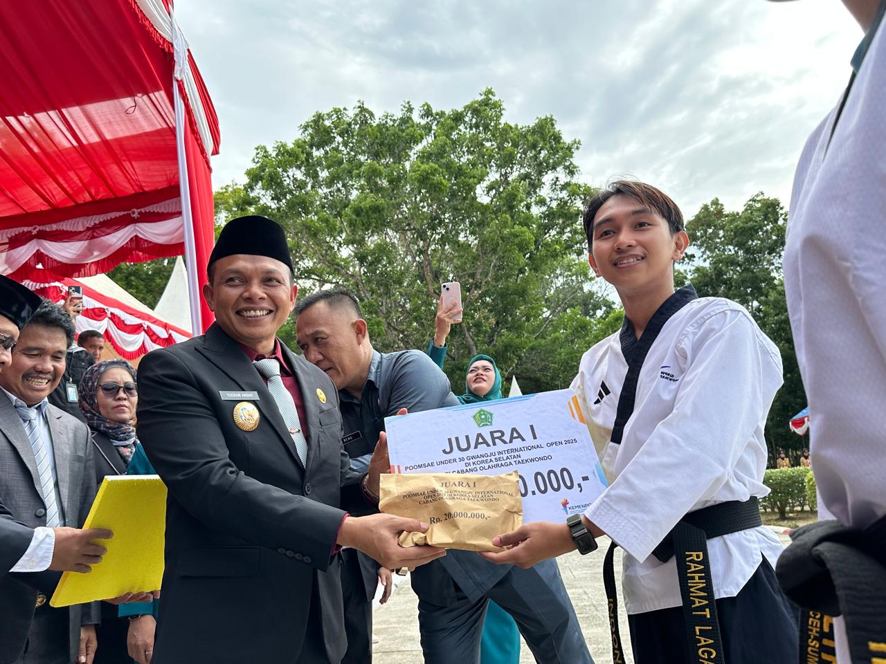 Acara kemudian dilanjutkan dengan pemberian penghargaan berupa uang tunai kepada dua pemuda yang merupakan atlet Taekwondo berprestasi. Penghargaan pertama dengan bonus Rp20 juta diberikan kepada Rahmat Lagaligo, Juara 1 Poomasae Under 30 Gwangju Internasional Open 2025 di Korea Selatan. Penghargaan kedua diberikan dengan bonus Rp10 juta diberikan kepada Iluh Sinta Sundariyasih, persih Medali Perunggu Pekan Olahraga Nasional PON Aceh-Sumut 2024 dan Medali Perunggu PON Beladiri, Kudus Jawa Tengah, September 2025.