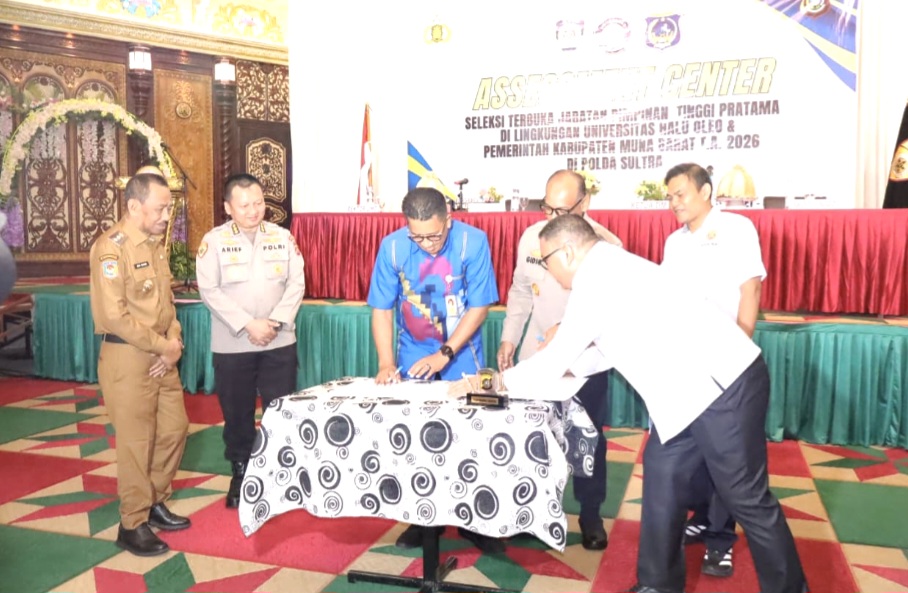 Penandatanganan kerja sama yang berlangsung di Hotel Qubah 9, Kota Kendari, pada Selasa (31/3/2026) pagi tersebut dihadiri oleh Wakapolda Sultra Brigjen Pol Dr. Gidion Arief Setyawan, S.I.K., S.H., M.Hum., Rektor Universitas Halu Oleo Herman, S.H., LL.M., Wakil Bupati Muna Barat Drs. Achmad Lamani, Ketua Tim Asesor Mabes Polri Kombes Pol Yusup Rahmanto, S.I.K., M.H., serta Karo SDM Polda Sultra Kombes Pol Dr. Arief Fitrianto, S.H., S.I.K., M.M.