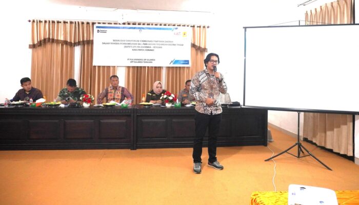 MEDIASULTRA.CO.ID I KONAWE – Sekretaris Daerah (Sekda) Kabupaten Konawe, Dr. Ferdinand, SP., MH, mewakili Bupati Konawe Yusran,ST secara resmi membuka kegiatan sosialisasi dan Forum Koordinasi Pimpinan Daerah (Forkopimda) dalam rangka pembangunan Saluran Udara Tegangan Ekstra Tinggi (SUTET) 275 kV Andowia–Kendari, bertempat di Aula Inowa, Rabu (28 /8/ 25).