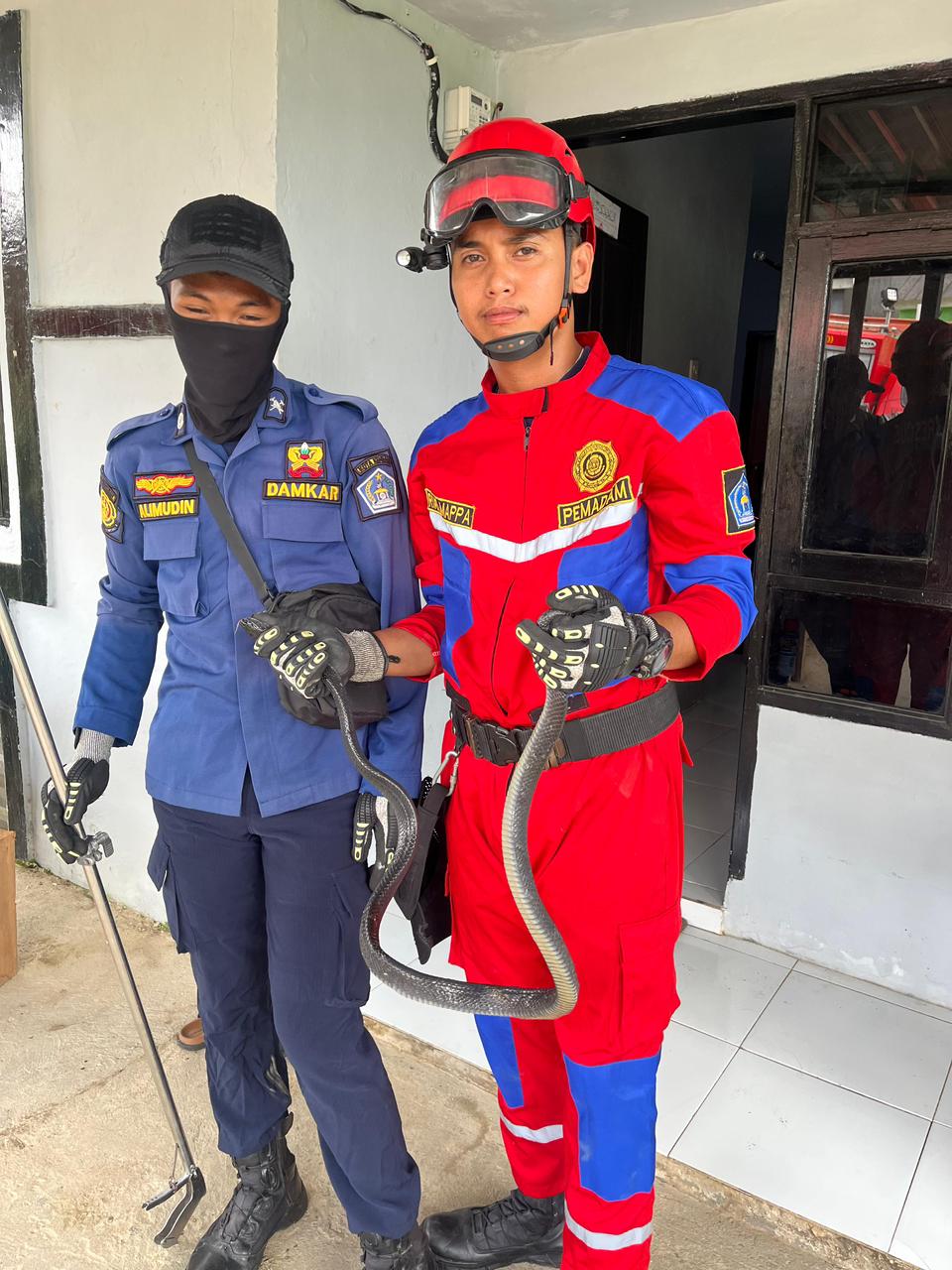 Tim Damkar tiba di lokasi dengan menggunakan unit rescue. Mereka langsung melakukan evakuasi ular tersebut dengan hati-hati.