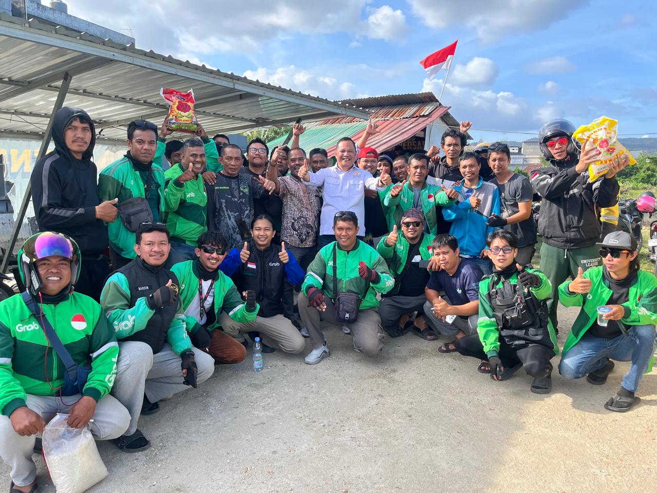 Pembagian beras ini berlangsung di Jalan Syech Yusuf Kota Kendari. Ratusan pengemudi ojol tampak antusias dan tertib mengantre untuk menerima bantuan tersebut.